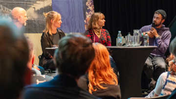 Det første oplæg om historiefortælling bar titlen ’Who owns the stories?‘. På scenen var den engelske forsker Jess Crombie fra University of the Arts, London. Jess Crombie har dedikeret de seneste næsten to årtier af sit professionelle liv til at advokere for en mere hensynsfuld og etisk tilgang til dokumentarisk historiefortælling.