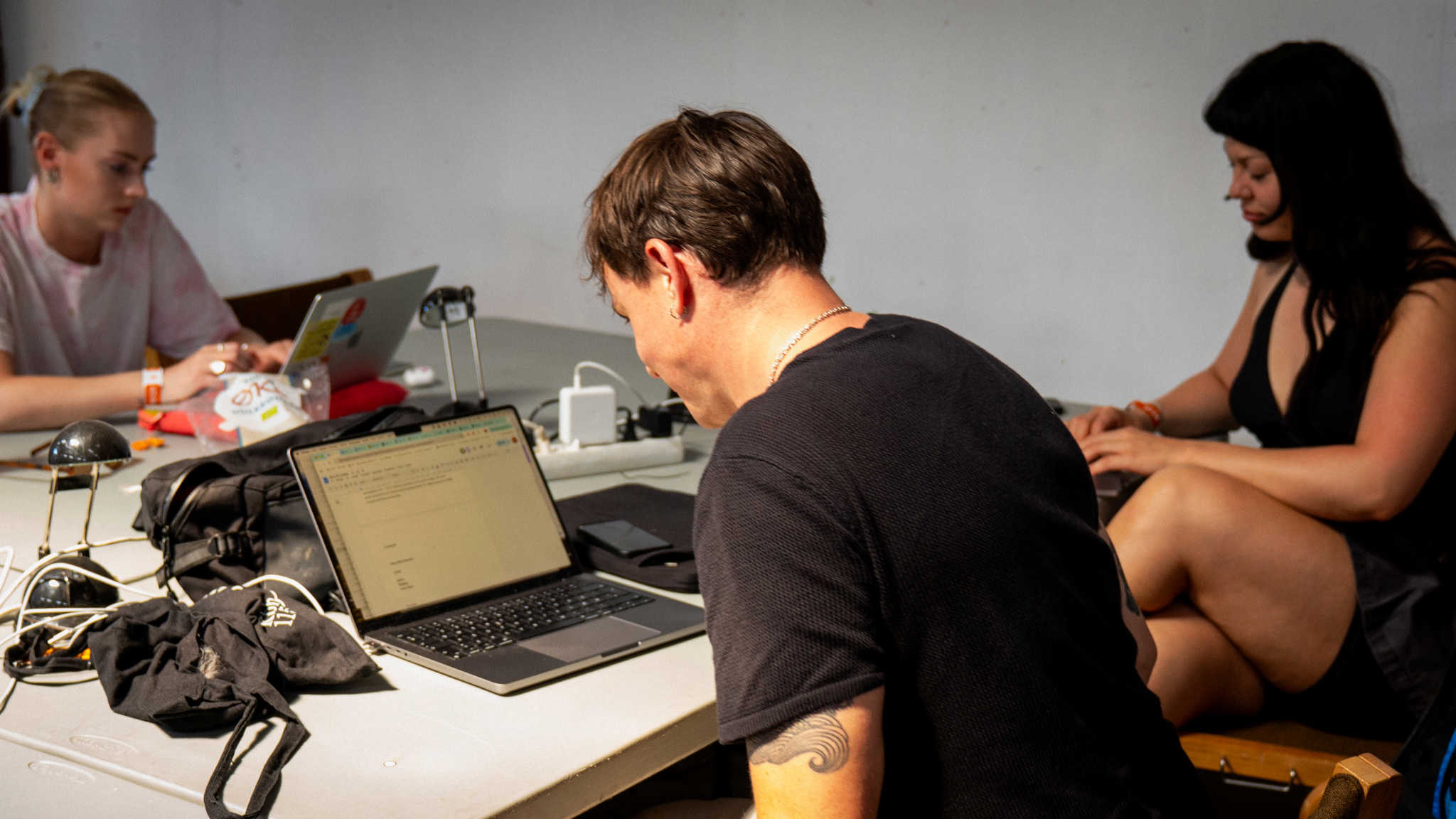 Publikumsredaktion hos Passive/Aggressive til årets Roskilde Festival. Annika Glargaard (tv.) og Emma Nophiran (th.). Foto: Aske Øland Kjærgaard.