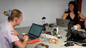 Publikumsredaktion hos Passive/Aggressive til årets Roskilde Festival. Annika Glargaard (tv.) og Emma Nophiran (th.). Foto: Aske Øland Kjærgaard.